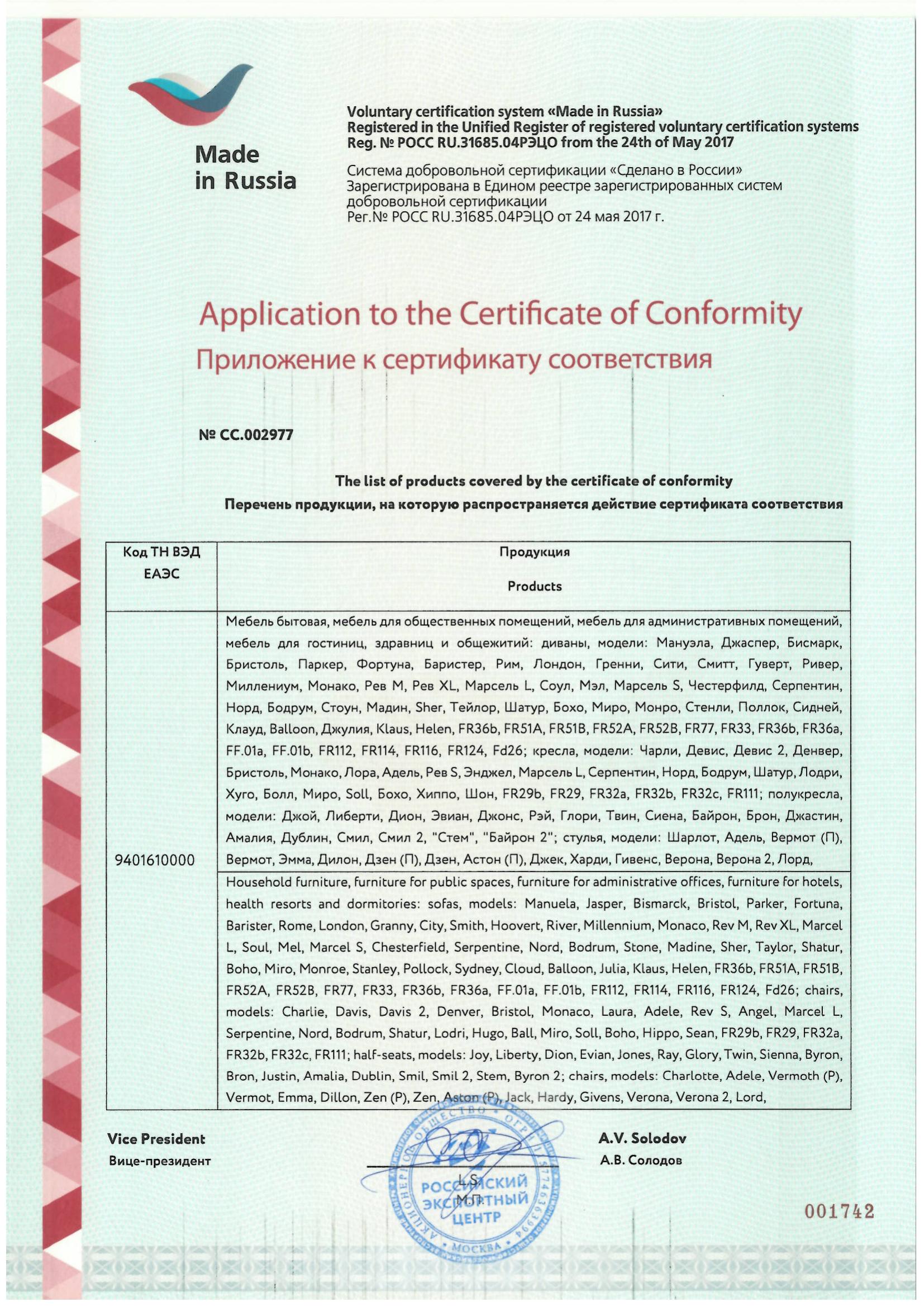 Наша продукция имеет официальный сертификат соответствия «Сделано в России» (Made in Russia) № СС.002977. Этот документ действителен до 14 сентября 2028 года и выдан на основании реальных протоколов лабораторных испытаний. Для наших партнеров-отельеров это означает юридическую безопасность: комплектация объекта мебелью CorsaStyle автоматически закрывает вопросы контролирующих органов по безопасности и происхождению материалов.